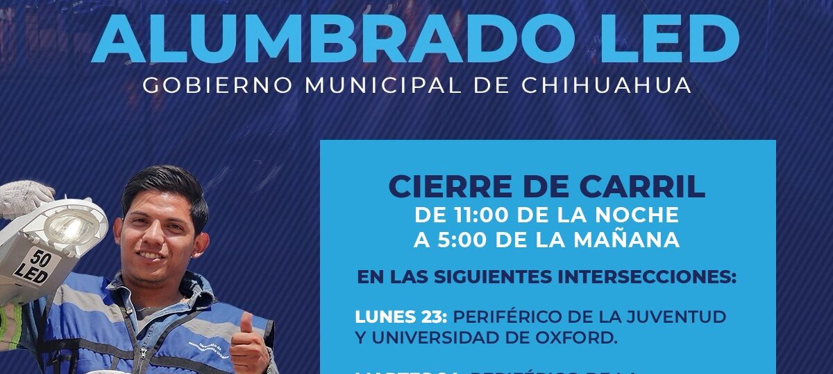 El Gobierno Municipal, a través de la Dirección de Mantenimiento Urbano, informa a la ciudadanía por trabajos de modernización del alumbrado público con tecnología LED en los bajo puentes del Periférico de la Juventud que cruzan con la avenida Homero y en la Universidad de Oxford los días lunes y martes a partir de las 11:00 de la noche.
