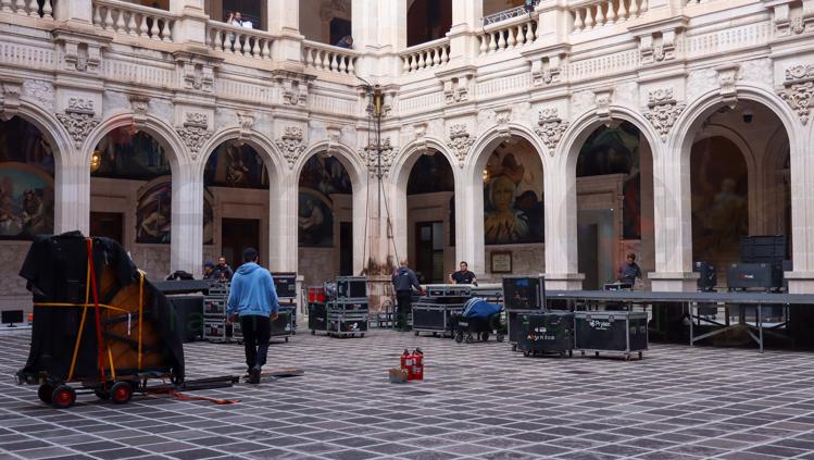 En el patio de Palacio de Gobierno, comenzaron con la instalación para el escenario en donde se va a desarrollar la invitación a la Feria de San Marcos, la cual encabezará la gobernadora Maru Campos, acompañada por su homóloga de Aguascalientes, Tere Jiménez.