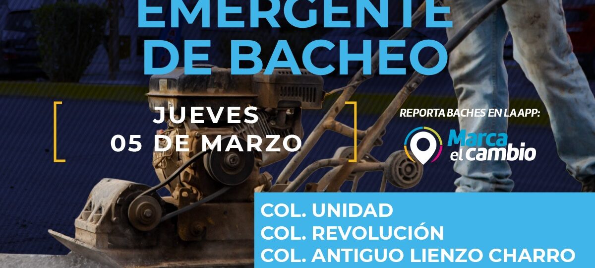 El Gobierno Municipal, a través de la Dirección de Obras Públicas, realizará trabajos de bacheo este jueves 5 de marzo mediante el programa emergente en las calles de las colonias: Unidad, Revolución, Antiguo Lienzo Charro y Lomas Altas, así como en la avenida Politécnico Nacional.
