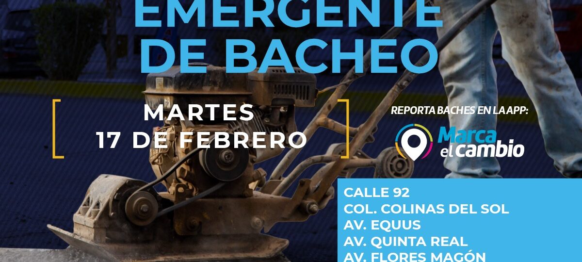 El Gobierno Municipal, a través de la Dirección de Obras Públicas, realizará trabajos de bacheo este martes 17 de febrero mediante el programa emergente en la calle 92, colonia Colinas del Sol, así como las avenidas: Equus, Quinta Real, Flores Magón, Paseos del Real y De la Cantera además del periférico R. Almada