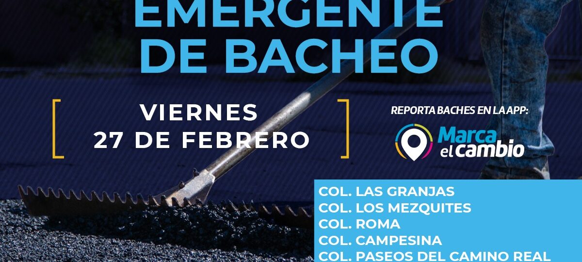 El Gobierno Municipal, a través de la Dirección de Obras Públicas, realizará trabajos de bacheo este viernes 27 de febrero mediante el programa emergente en las calles de las colonias: Las Granjas, Los Mezquites, Roma, Campesina, Paseos del Camino Real y Punta Oriente, así como en la avenida Oriente 1 y en el periférico de la Juventud.
