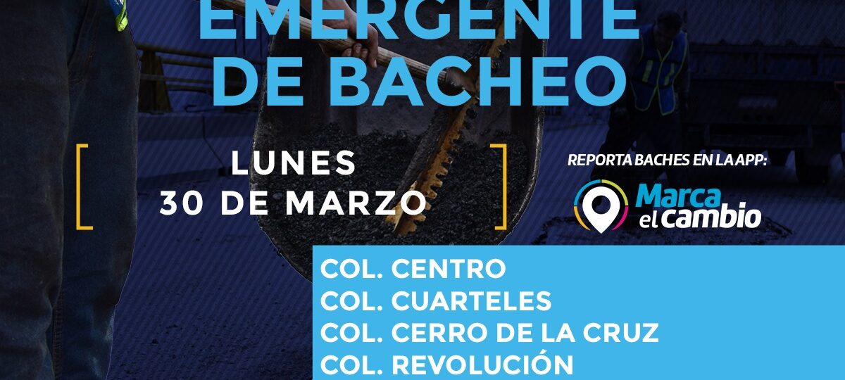 El Gobierno Municipal, a través de la Dirección de Obras Públicas, realizará trabajos de bacheo este lunes 30 de marzo mediante el programa emergente en las calles de las colonias: Centro, Cuarteles, Cerro de la Cruz, Revolución, así como en las avenidas Heroico Colegio Militar, Tecnológico y periférico Lombardo Toledano.