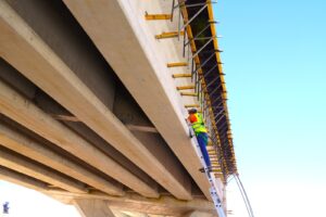 Con diversas actividades en distintos frentes de trabajo, esta emblemática obra sigue tomando forma día con día. Actualmente se mantiene el montaje de trabes de concreto reforzado, de las cuales más de 40 ya han sido colocadas, además de realizarse trabajos de cimbrado para la losa superior, como parte de la conformación de la superestructura del puente.