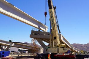 Con diversas actividades en distintos frentes de trabajo, esta emblemática obra sigue tomando forma día con día. Actualmente se mantiene el montaje de trabes de concreto reforzado, de las cuales más de 40 ya han sido colocadas, además de realizarse trabajos de cimbrado para la losa superior, como parte de la conformación de la superestructura del puente.