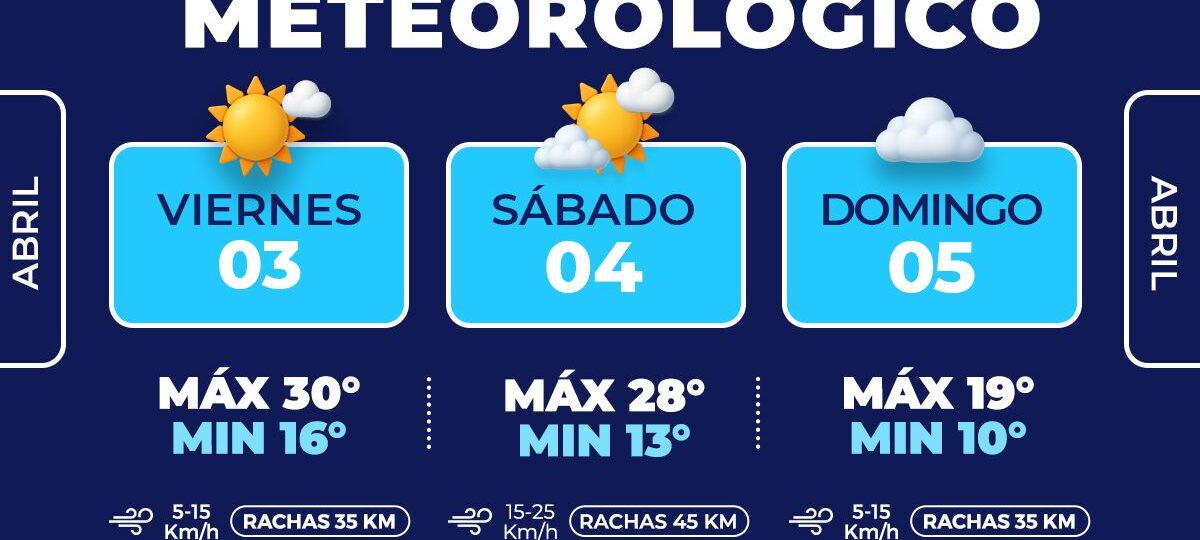 Para el sábado 4 de abril, se prevé un clima parcialmente nublado, con temperaturas de 28°C máxima y 13°C mínima, rachas de viento de hasta 45 kilómetros por hora, con una ligera probabilidad de lluvia del 2 por ciento.
