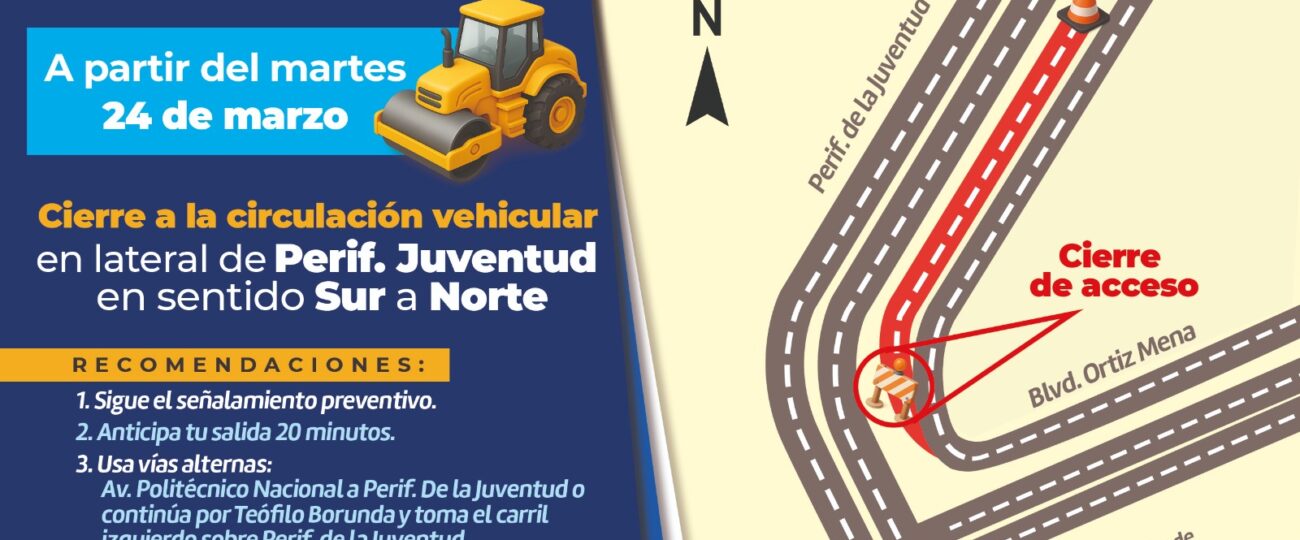 Como parte de la construcción de la Gaza de Incorporación en Teófilo Borunda y periférico de la Juventud, la Dirección de Obras Públicas del Gobierno Municipal, informa el cierre temporal de la lateral intermedia del periférico de la Juventud, en sentido del boulevard Ortiz Mena hacia el norte, por lo que se exhorta a las y los conductores a extremar precauciones al circular por la zona.