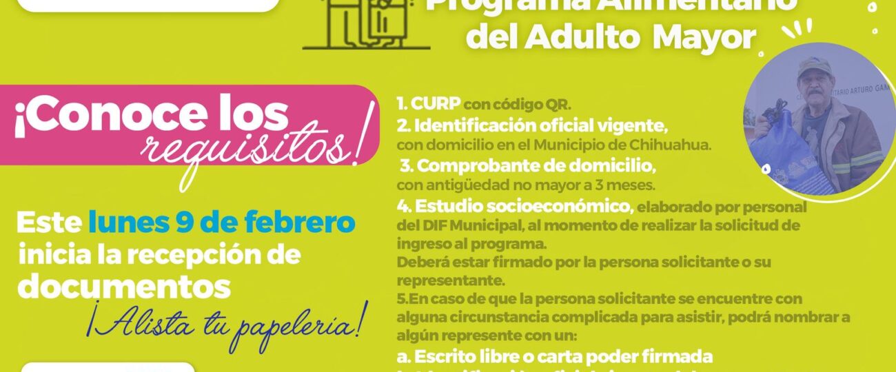 El Gobierno Municipal, a través del DIF Municipal, dio a conocer los requisitos para ser beneficiario del Programa Alimentario y de Desarrollo Humano del Adulto Mayor (PAAM) 2026, dirigido a personas mayores de 60 años que habitan en el municipio de Chihuahua.