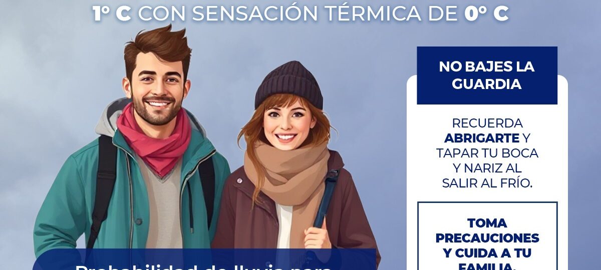 La Coordinación Municipal de Protección Civil, informa que a partir de la próxima semana se espera un descenso en las temperaturas con mínimas de hasta 1°C o 2°C, con sensación térmica de gasta 0°C, por lo que exhortan a cuidarse.