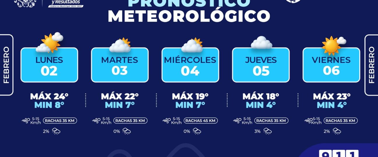 La Coordinación Municipal de Protección Civil informa que, durante la semana del lunes 2 al viernes 6 de febrero, se prevé un comportamiento climático con descenso gradual de temperaturas, mayor presencia de nubosidad a mitad de semana y condiciones mayormente estables en la capital del estado.