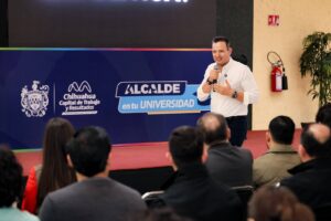 En el marco del programa “Alcalde en tu Universidad”, el presidente municipal Marco Bonilla visitó la Facultad de Contaduría y Administración de la Universidad Autónoma de Chihuahua (UACH), donde dialogó con estudiantes sobre los retos de la política actual, los avances del Gobierno Municipal en materia de seguridad, desarrollo económico y educación, así como la importancia de que las y los jóvenes se involucren activamente en la toma de decisiones de la ciudad.