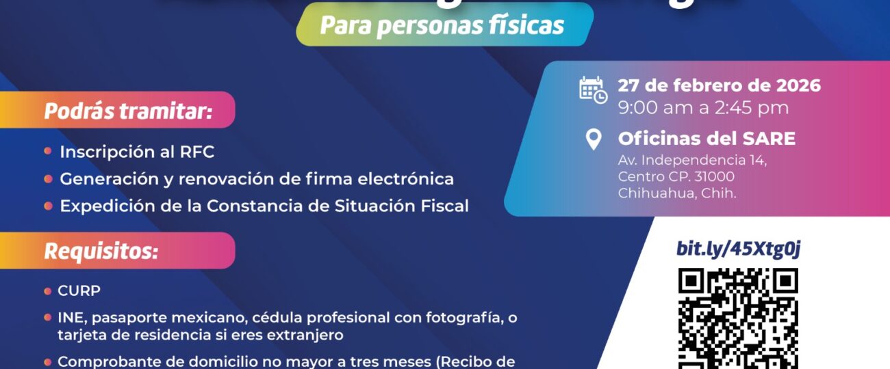 El Gobierno Municipal de Chihuahua, a través de la Dirección de Desarrollo Económico y Competitividad en colaboración con el Servicio de Administración Tributaria (SAT), informa a la población que el próximo viernes 27 de febrero podrán realizar trámites fiscales y administrativos para personas físicas en las instalaciones del SARE.