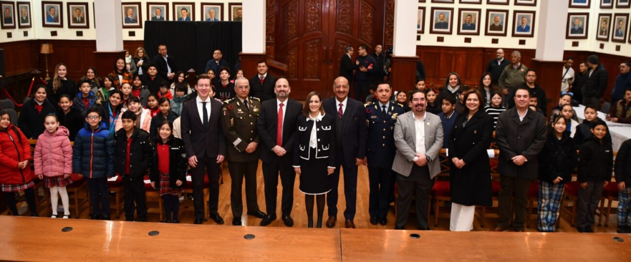 Como parte de la ceremonia, el alumnado interpretó el Himno a la Constitución, con el acompañamiento de la Banda de Música de Gobierno del Estado de Chihuahua y la soprano Silvia Sandoval.