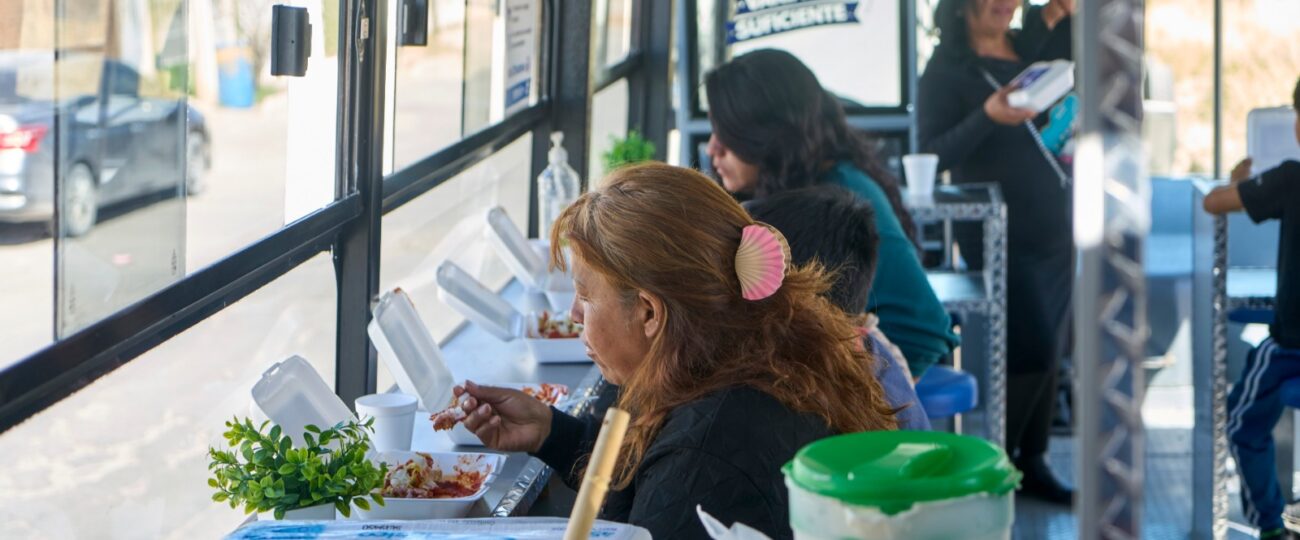 El comedor móvil de NutriChihuahua cuenta con el equipamiento necesario para la preparación y distribución de los platillos, con un menú similar al de los comedores fijos, lo que permite a las y los beneficiarios consumirlos de manera cómoda en su interior.