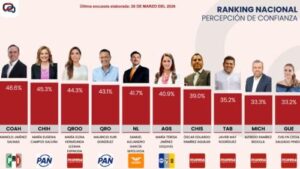 Uno de los datos más relevantes del estudio es el nivel de confianza. La gobernadora de Chihuahua alcanza un 45.3%, lo que la coloca en el segundo lugar nacional en este rubro, solo detrás de Manolo Jiménez Salinas.