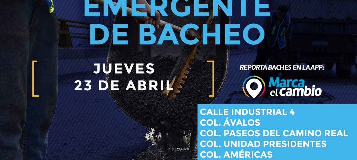 El Gobierno Municipal, a través de la Dirección de Obras Públicas, realizará trabajos de bacheo este jueves 23 de abril mediante el programa emergente en la calle Industrial 4 así como en las colonias: Ávalos, Paseos del Camino Real, Unidad Presidentes, Américas, San Felipe V Etapa, 20 Aniversario, Campo Bello y Dale.