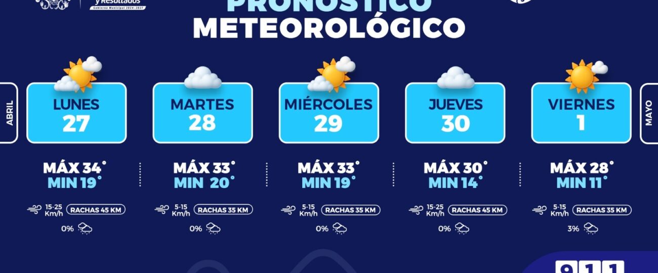 Para este lunes 27 de abril, se pronostica un día parcialmente nublado, con una temperatura máxima de 34 grados y mínima de 19 grados, con vientos de 15 a 25 kilómetros por hora y rachas de hasta 45 km/h, sin probabilidad de lluvia.