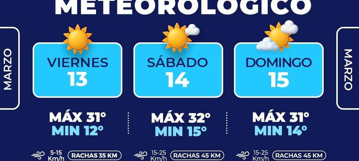 La Coordinación Municipal de Protección Civil informa que, para este fin de semana, del 13 al 15 de marzo, se prevén temperaturas cálidas, cielo mayormente despejado y sin probabilidad de lluvias.