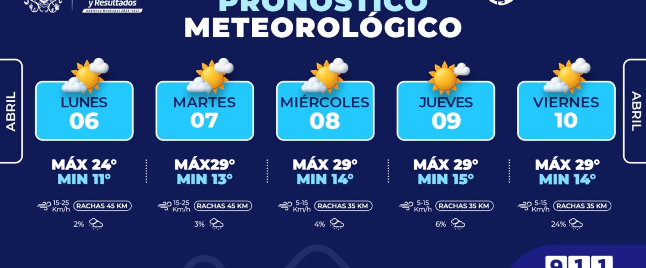 La Coordinación Municipal de Protección Civil informa que, para los próximos días, se prevén condiciones mayormente estables con cielos nublados, con temperaturas en ascenso gradual y baja probabilidad de lluvias, aunque con presencia de viento moderado en algunos días.