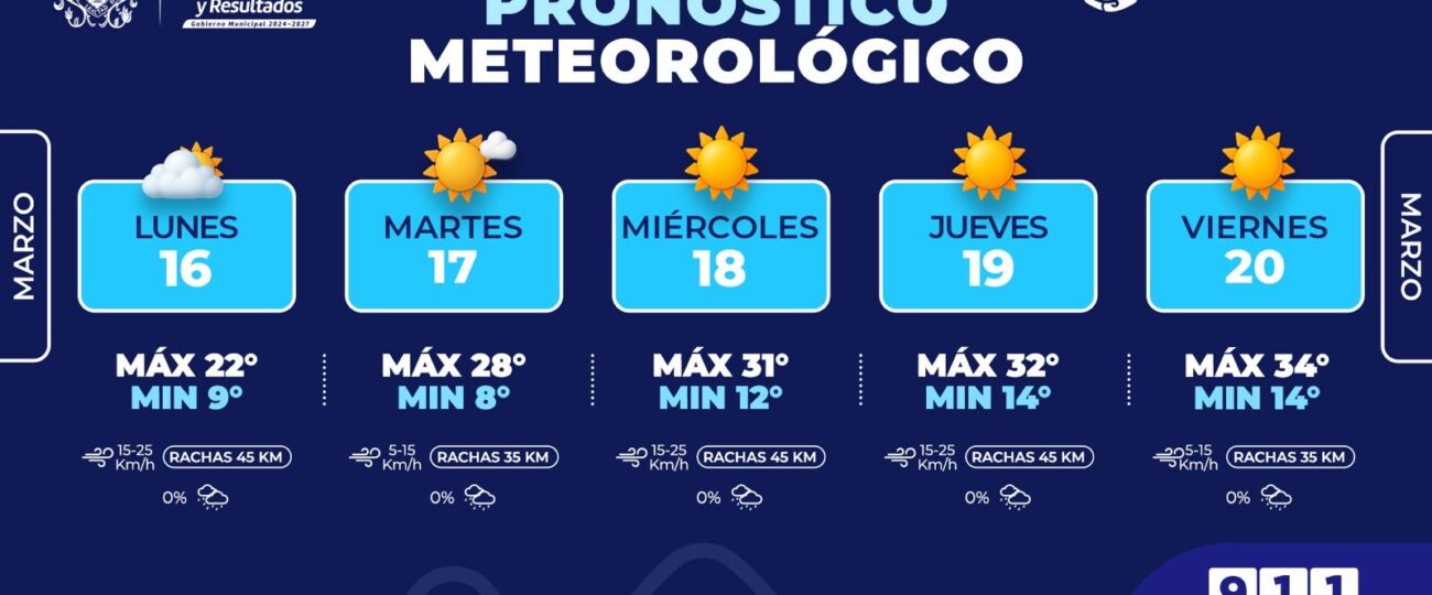 La Coordinación Municipal de Protección Civil, informa que, para la semana del 16 al 20 de marzo, pronostican un incremento gradual en las temperaturas, por lo que exhortan a cuidarse del calor y seguir recomendaciones para evitar afectaciones a la salud.