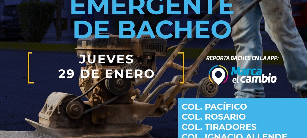 El Gobierno Municipal, a través de la Dirección de Obras Públicas, realizará trabajos de bacheo este jueves 29 de enero mediante el programa emergente en calles de las colonias: Pacífico, Rosario, Tiradores, Ignacio Allende, Insurgentes y Las Granjas.