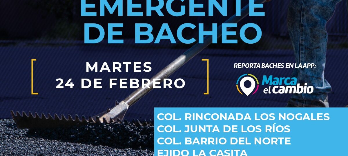 El Gobierno Municipal, a través de la Dirección de Obras Públicas, realizará trabajos de bacheo este martes 24 de febrero mediante el programa emergente en las calles de las colonias: Rinconada Los Nogales, Junta de los Ríos y Barrio del Norte, así como en la avenida Paseos del Real, vialidad Los Nogales y en el Ejido La Casita.