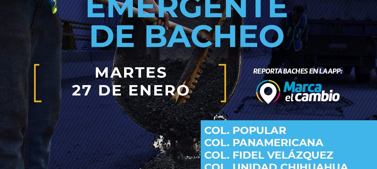 El Gobierno Municipal, a través de la Dirección de Obras Públicas, realizará trabajos de bacheo este martes 27 de enero mediante el programa emergente en calles de las colonias: Popular, Panamericana, Fidel Velázquez, Unidad Chihuahua, Virreyes y Quintas Carolinas.