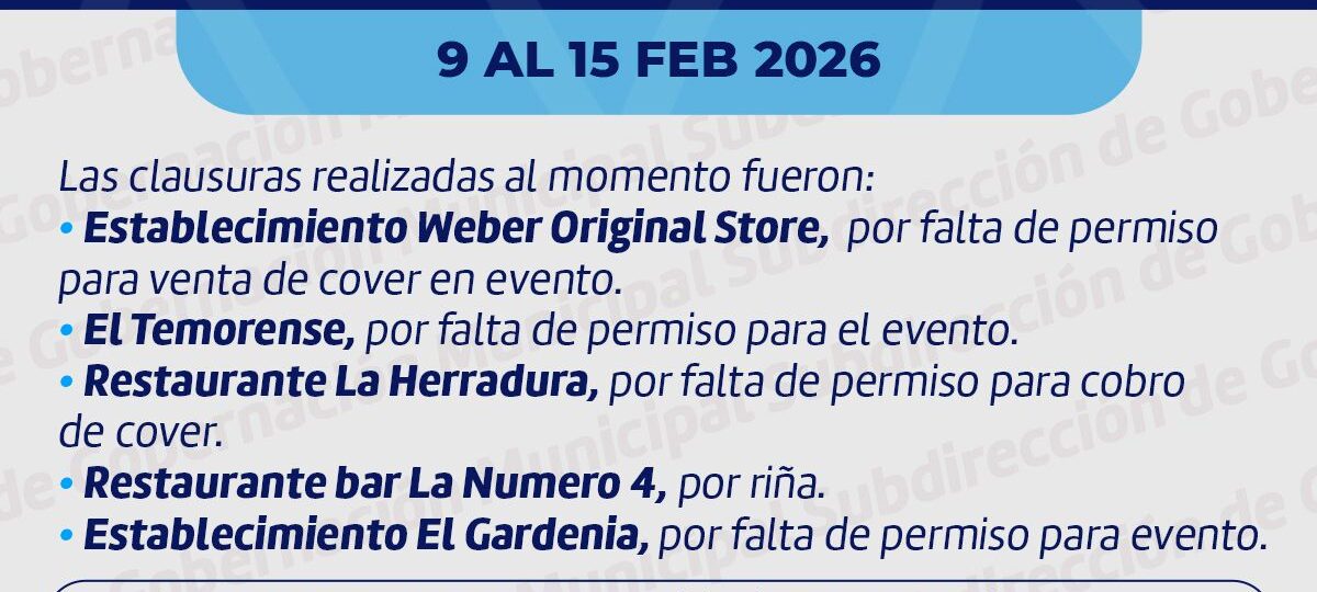 El Gobierno Municipal de Chihuahua, a través de la Subdirección de Gobernación de la Secretaría del Ayuntamiento, informa que del 9 al 15 de febrero se realizaron 202 inspecciones a locales y establecimientos, resultando en 16 actas administrativas por diversos motivos y 15 clausura en total.